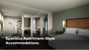 Each property will feature a streamlined public area filled with natural light that includes a simple retail market, a large guest laundry room and a state-of-the-art fitness center. There will also be a spacious outdoor gathering area, which includes a fire pit, grills, and comfortable seating for guests looking to connect. Guest studio suites include a fully equipped kitchen with a full-sized refrigerator, dishwasher, microwave, and two-burner cooktop, along with ample storage options for the long-stay traveler.