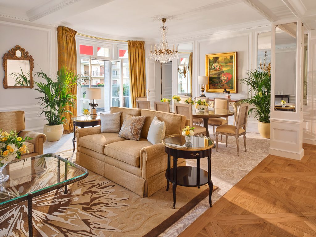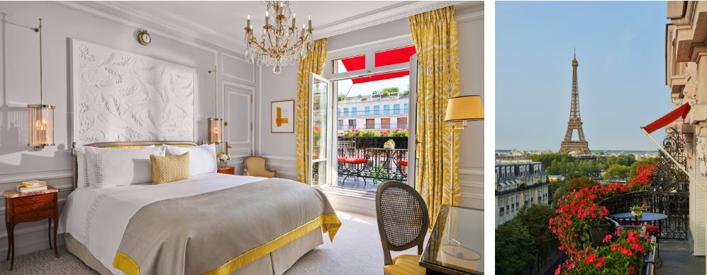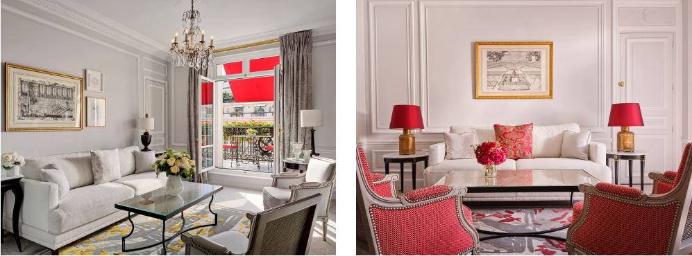 The six balcony rooms and suites on the sixth floor, which are surrounded by the hotel’s famous red geraniums, have also been renovated. Famed for welcoming high profile guests across the decades, the rooms offer uninterrupted views of the Eiffel Tower and the avenue Montaigne.