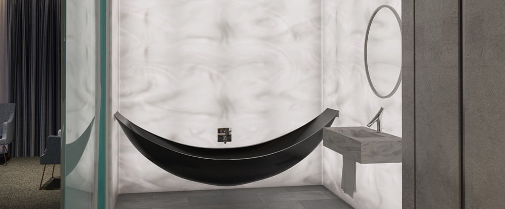 The beautifully designed Hammock Bath from Splinter Works, is the ultimate vehicle for total escapism. This show-stopping floating bath has literally elevated the immersive comfort of soaking in a hot tub by combining it with the peaceful experience of kicking-back in a hammock for the ultimate bathroom experience for guests. Unlike most bath tubs, with flat bottoms and steep backs, the continuous curved surface of the hammock bath gives an unprecedented level of comfort that encourages long, luxurious bathing. Made in England from carbon fibre, which is incredibly strong and stays completely rigid even when fully loaded, the Hammock Bath is designed for use in a wet room. It is suspended from the walls, doesn’t touch the floor and is filled using a floor standing tap with waste water released to a floor drain beneath the tub. The hammock bath can be specified at any length between 2.6 and 3.0 metres.