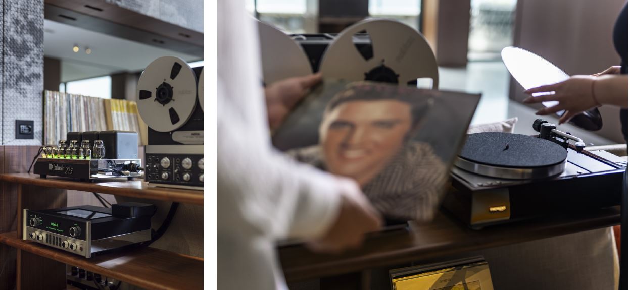 The suite’s core system now features Klipsch La Scala II speakers, a glowing McIntosh MC275 amplifier, a MacIntosh C22 Preamp, a Thorens 1601 turntable with Sumiko Amethyst cartridge and the restored Revox deck that sparked the entire vision. To this, he added more than 500 LPs from his personal collection—from Deutsche Grammophon box sets to original press- Bowie—and a promise that any guest’s personal favourites will be sought out and added to the library.