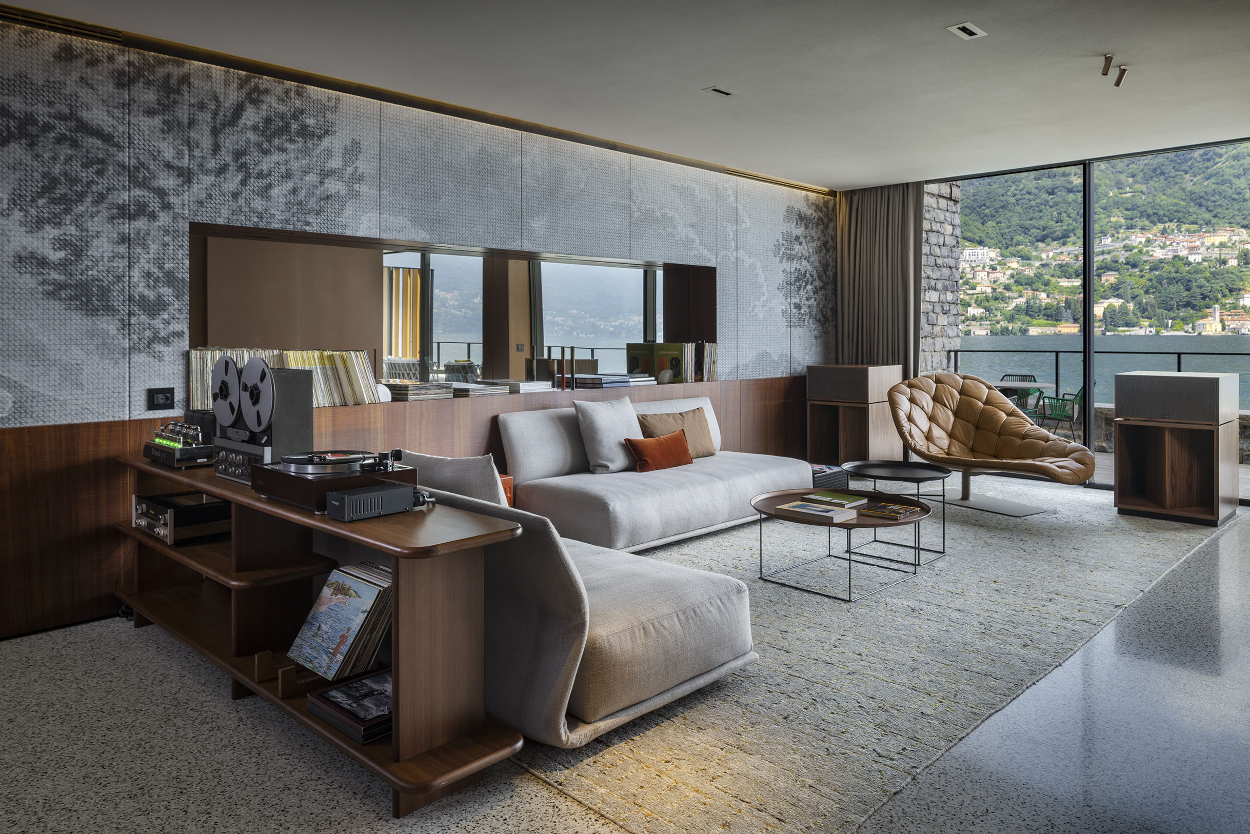 At Contreras’ request, Studio Urquiola conceived a sculptural round stone table seating up to ten guests, set atop a richly coloured custom rug and positioned directly before the audio system, with Lake Como unfolding beyond. An evening here—watching the hypnotic motion of the Revox Reel-to-Reel, immersed in music, taking in the lake views, and enjoying Chef Lenzi’s refined cuisine alongside a well-chosen Italian wine—offers a sensory experience that is both intimate and unforgettable.
