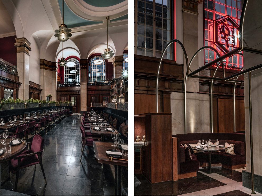 London based design agency Russell Sage Studio, specialists in commercial and hospitality interior design, were the creative brains behind this unique project. The restaurant spans three floors and includes distinctive and quirky elements such as offering private dining in the underground bank vault, there are two additional private dining rooms, a bar and mezzanine for drinks plus the main restaurant on the ground floor.