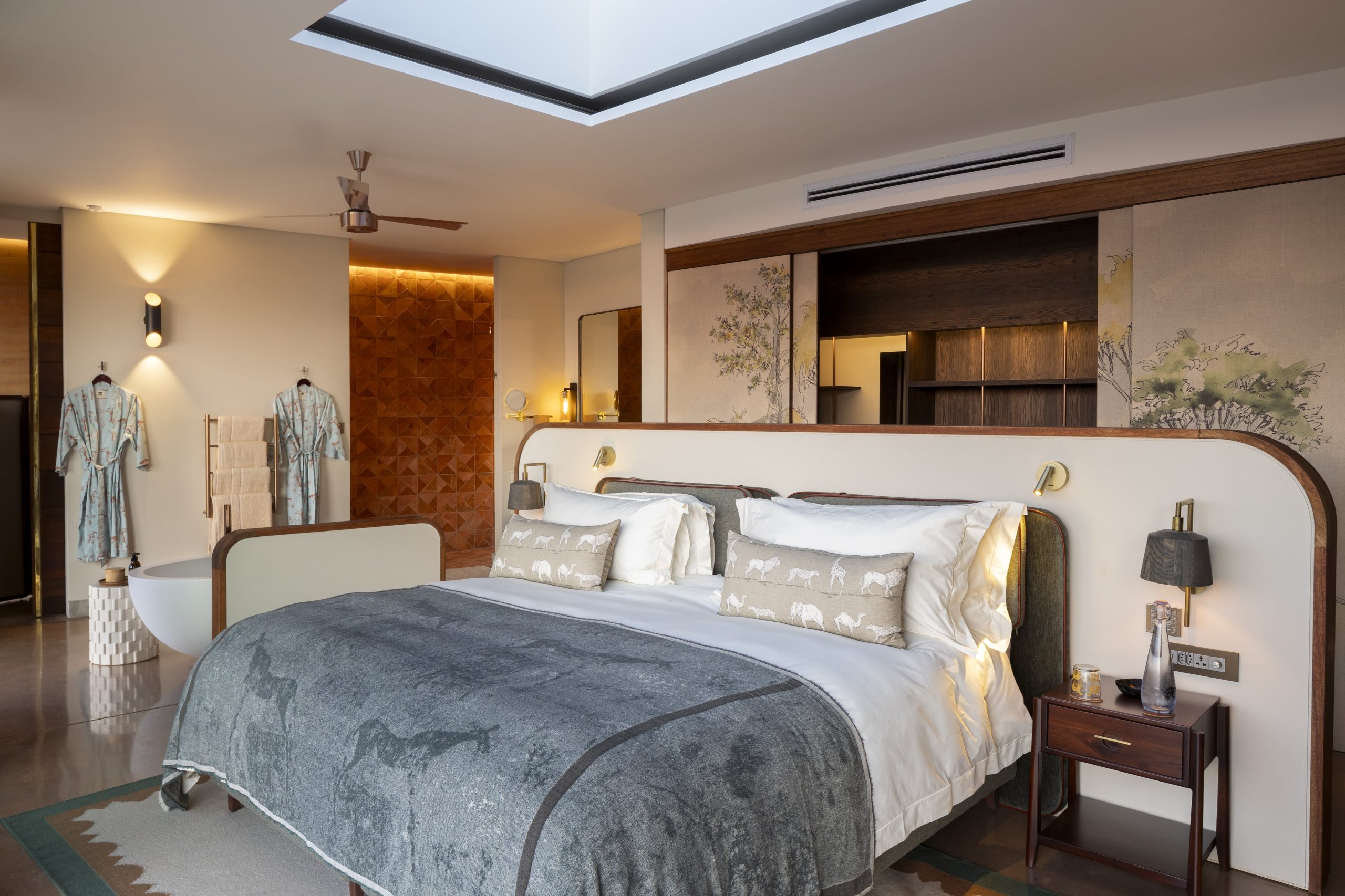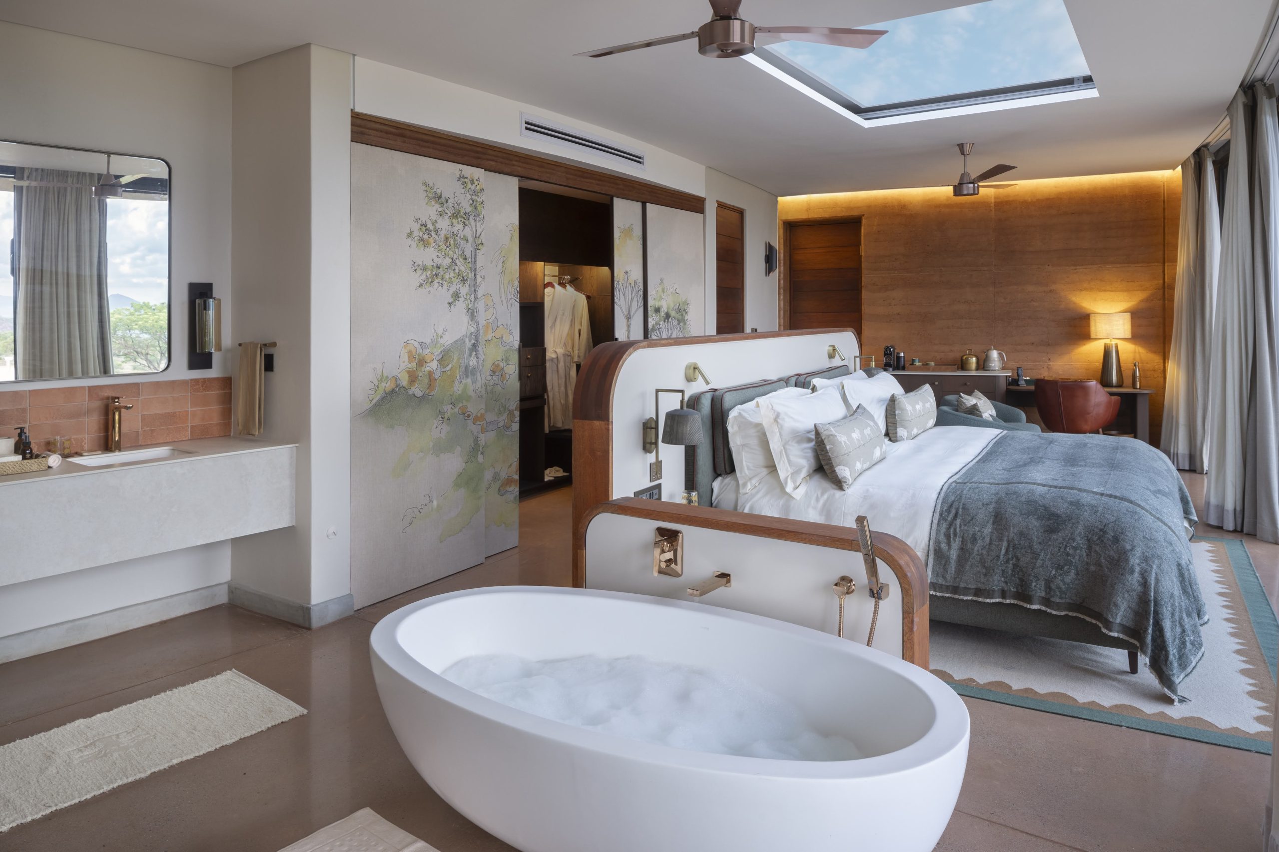 South African artisans and artists are extensively used throughout the project. For example, artwork by Clive Walker, legendary conservationist and artist who founded The Endangered Wildlife Trust, has personally painted a scene of the landscape surrounding the lodge, which has been converted into a fabric by Evolution Product and is featured in the wardrobes. Evolution Product has also interpreted the rock art into custom-made bed throws whilst the bespoke hemp table linen has been hand-embroidered by the talented women of the Mogalakwena community project. The bathroom tiles reflecting the surrounding landscape and terrain are also manufactured by a prestigious local tiling company, Wolkberg Casting Studio. Renowned artists have also crafted stunning artworks exclusively commissioned for Melote House. Among them are Darryn Eggleton, Bruce Little, Sophie Niemann, and Stephen Rew, a distinguished recipient of the David Shepherd Wildlife Artist of the Year award.