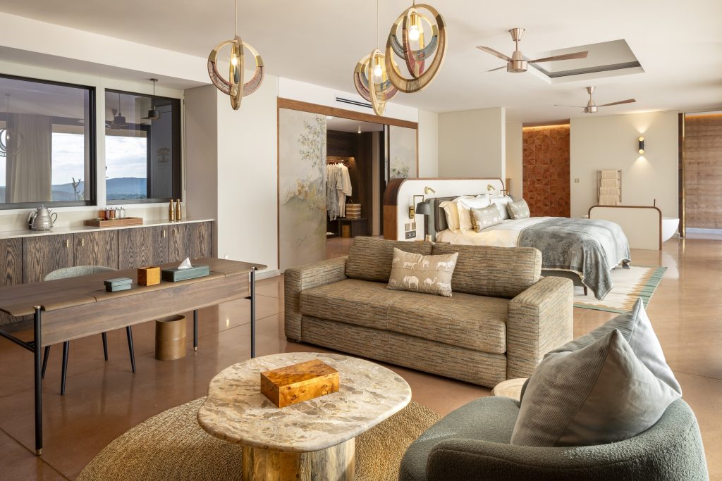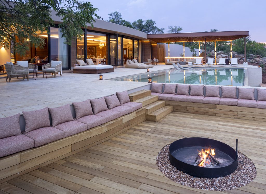 The main house sleeps 12 and an adjacent separate cottage with two ensuite bedrooms, a living area and a kitchen, sleeps four. The accommodations can be accessed via a buggy path from reception. The spacious Baobab Suite, situated on the third tier, boasts 120 sqm indoors, a 100 sqm outdoor living space, and a staircase leading to an integrated private sky bed deck – ideal for stargazing. The Baobab Suite features its own pool, double indoor shower, underfloor heating, outdoor shower, walk-in wardrobe and a bioethanol-fuelled cocoon fireplace. The Marula Suites, located on the second tier, offer interconnected options for families. Each suite, encompassing 100 sqm, includes a double indoor shower, double vanity, bath, and outdoor shower. The Seringa Suite, situated on the main tier, mirrors the amenities of the Marula Suites.
