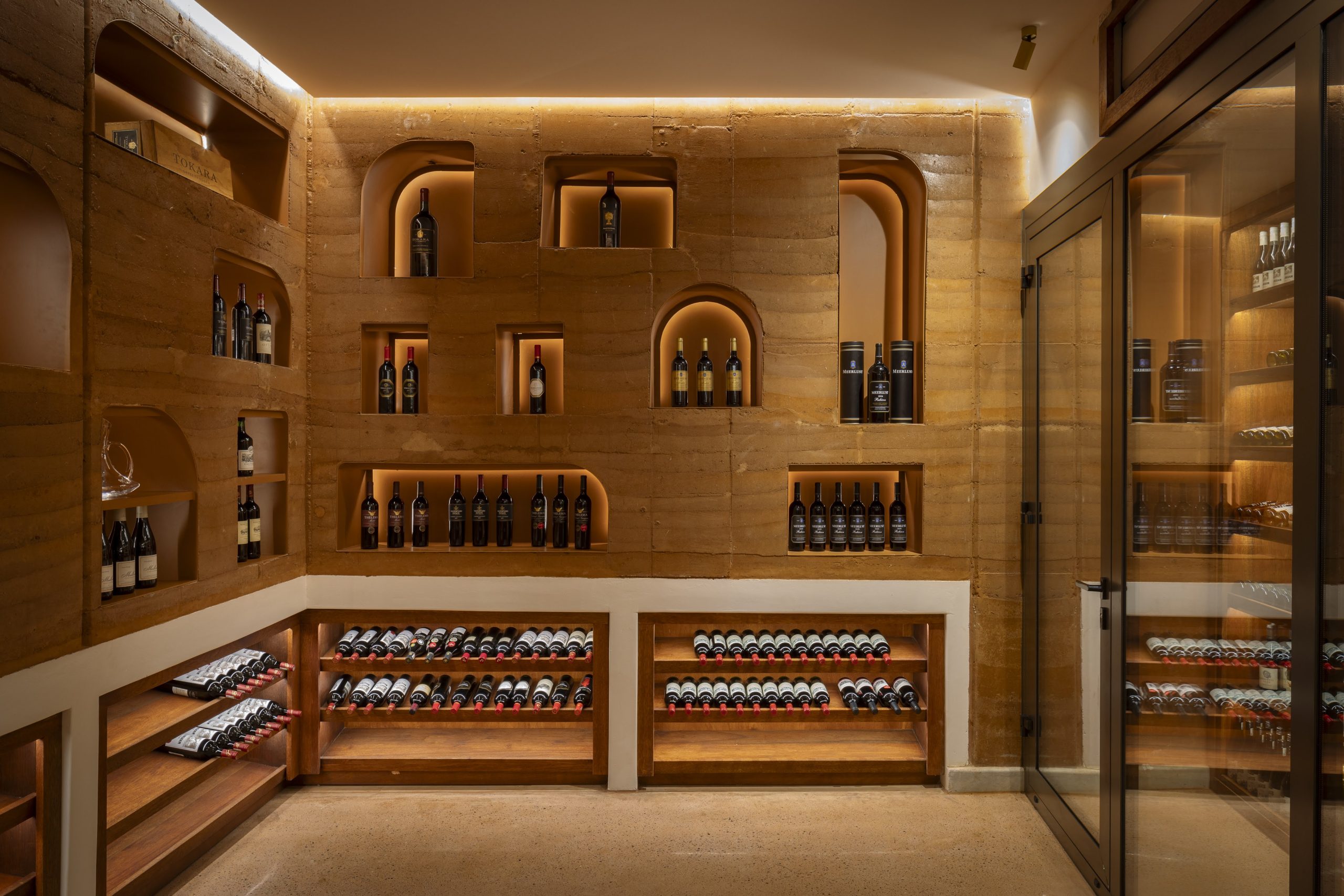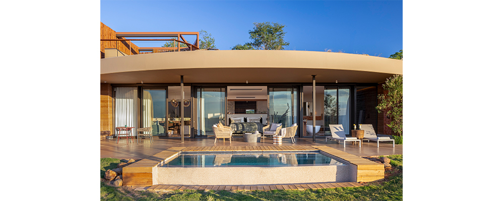 Drawing inspiration from the curved form of the mountain it sits upon, Melote House connects every room to the surrounding nature and through various defined thresholds leads the guest from the wilderness outside to a luxurious sanctuary ensconced in dramatic monolithic structures carved into the hillside. Concepts created by Yuji Yamazaki from YYA Architects, Jacobus Uys and Jessica Rogers from Black Sable Architects and Kelly Adami from Copperleaf Studio have come together to create a serene haven amidst the wilderness. Featuring impressive, rammed earth walls, built using the earth taken out of the hillside it sits on, the design allows for natural thermal stability and reduced use of energy consumption. The walls are soft and curved into the hill to blend seamlessly with the landscape and to give wide-angled views from the house.