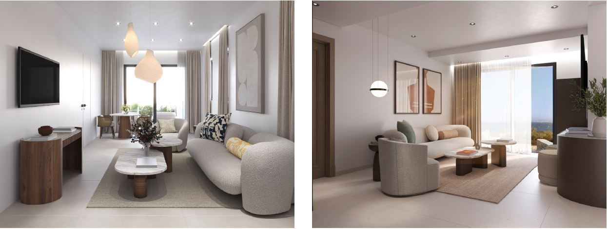 Left: Signature Suite Living Room. Right: One Bedroom Private Pool Suite Living Room