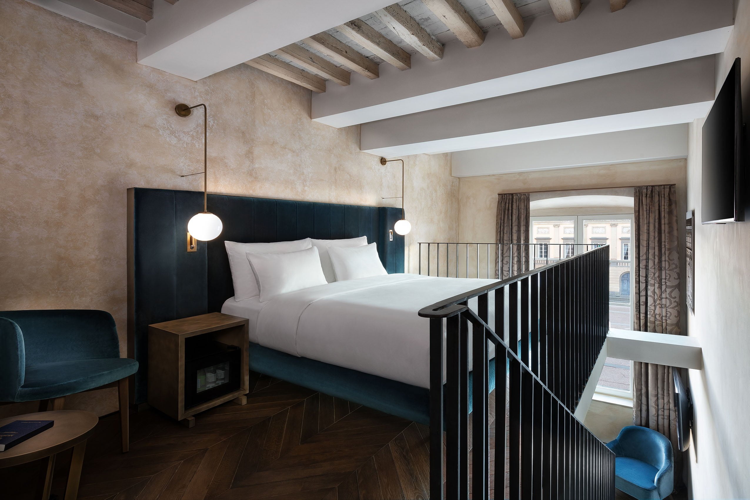 Honouring Lucca’s past as the ancient silk production capital of the Western World, silk and velvet textiles in earthy shades of grape red, pine green and Tuscan sun yellow characterise a number of spaces, notably the guestrooms and corridors. Similarly, playful nods to the region’s other significant industries are also incorporated into the design narrative; delicate wall tapestries with a floral glaze and an antique effect pay reverence to the region’s vineyards, and refined, glass and metal pendant lights in pay homage to the property’s glassblowing history.