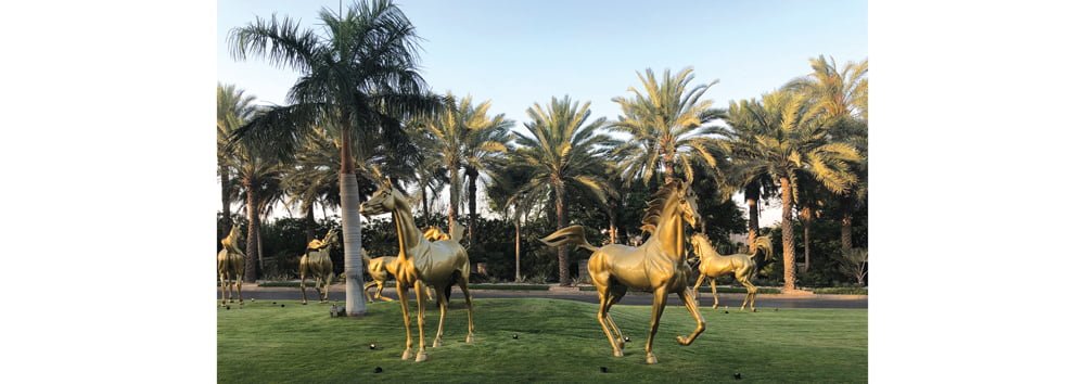The equestrian artworks give a gentle nod to the fondness for horse riding rooted deep in Arabic culture and history, and are integrated as a common thread throughout the resort from the golden horse statues leading the way up to the Porte Cochere into the guestrooms, corridors and suites.