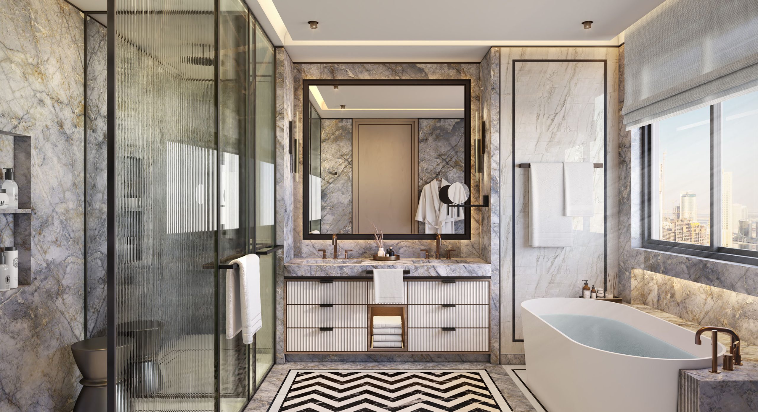 The penthouse level, dubbed Maison de Maître, is a study in grandeur. Grand French doors frame expansive skyline views. Neoclassical architectural elements meet contemporary craftsmanship, with collector’s cabinets, engraved panelling, and bespoke detailing. Here, residents inhabit a space that feels not only elevated but storied—a residence of distinction where luxury and legacy meet.