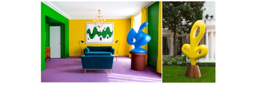 The work, an extension of Bertrand Lavier’s Walt Disney Productions series, continues in Le Bristol Paris’s iconic gardens where guests are met with three-metre-high, brilliantly bright sculptures amidst the green surrounds. This extraordinary exhibition – comic, colourful, creative and extreme – is the third collaboration between Parisian gallerist Kamel Mennour and Le Bristol Paris.