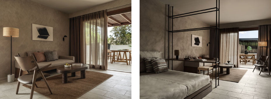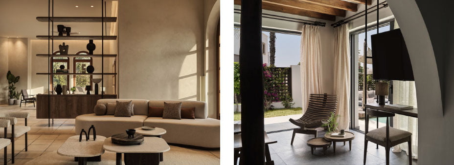 Lindian Village Beach Resort Rhodes features 188 spacious rooms and suites within a welcoming minimal ‘boho’ design, exuding refined elegance. Earthy tones and natural textures create a harmonious flow between the stunning surrounding nature and the relaxed indoor atmosphere. Each suite comes with either a private pool, veranda or Jacuzzi for an added touch of luxury.