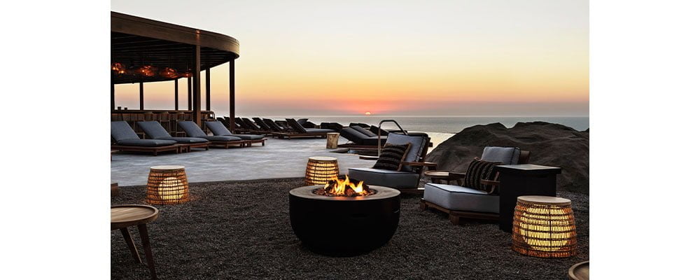 Inspired by the traditional Cycladic architecture that Santorini is known for, PEOPLE and ELASTIC Architects’ eco-conscious design honors the natural elements of the hotel’s landscape. Wood, stone, and volcanic, magma-black tones blend with minimal and sophisticated interiors, meanwhile the hotel architecture follows the curved formations of the lava-made slopes that surround it.