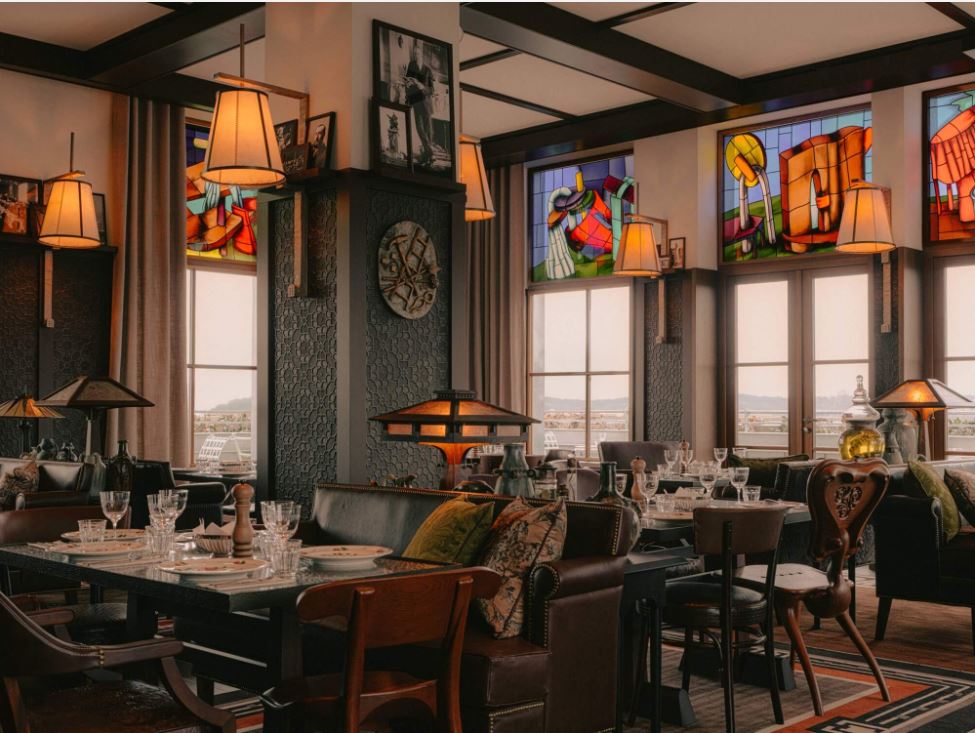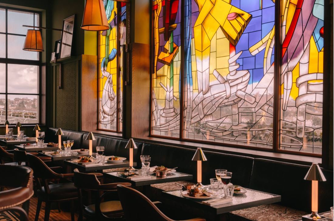 For this unique space, the multidisciplinary artist Ara Starck has created 19 stained glass windows, including a monumental one that casts a cathedral-like radiance of color, illuminating both the restaurants’ main hall and the city of Metz.