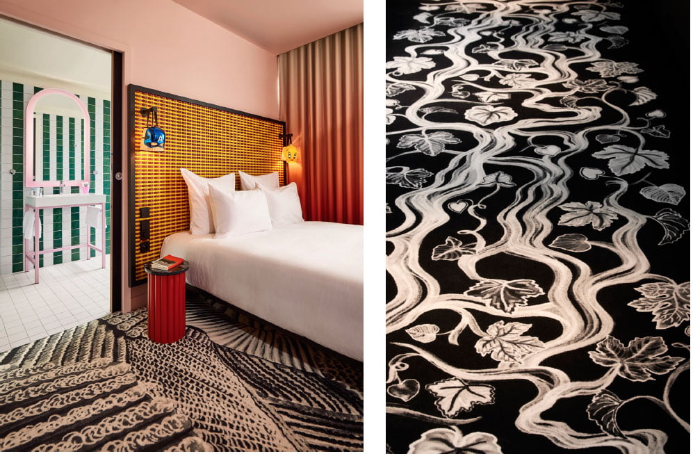 Playing with the existing structure and honouring its history, while respecting the rules of the French building code, was quite the exercise. “When you find yourself with a forest of concrete posts supporting the impressive structure, you rack your brains. ” Like an alchemist transforming lead into gold, the architect has transformed each pillar in the lobby and restaurant into works of art, decorated with frescoes by Beniloys, and golden ceramics by Arnold du Bazar d’Alger, a graphic artist, all of which compliment the cut-out silkscreens by Atelier Bingo. In the restaurant, attention is also drawn to the floor by two symmetrical carpets by Laureline Galliot where jacks clash, a reference to the archaeological digs that took place during the construction.