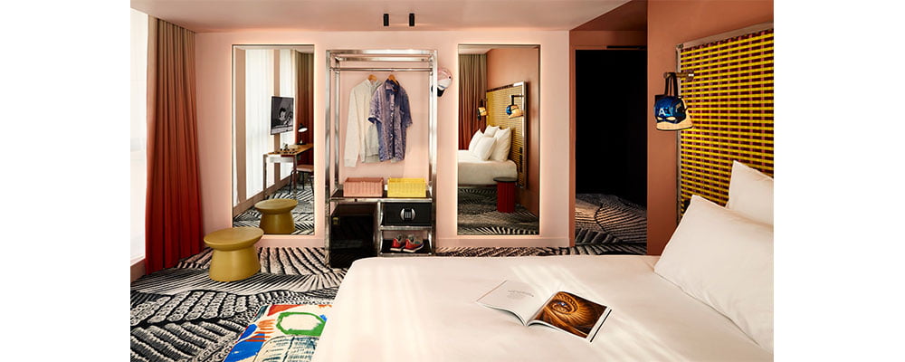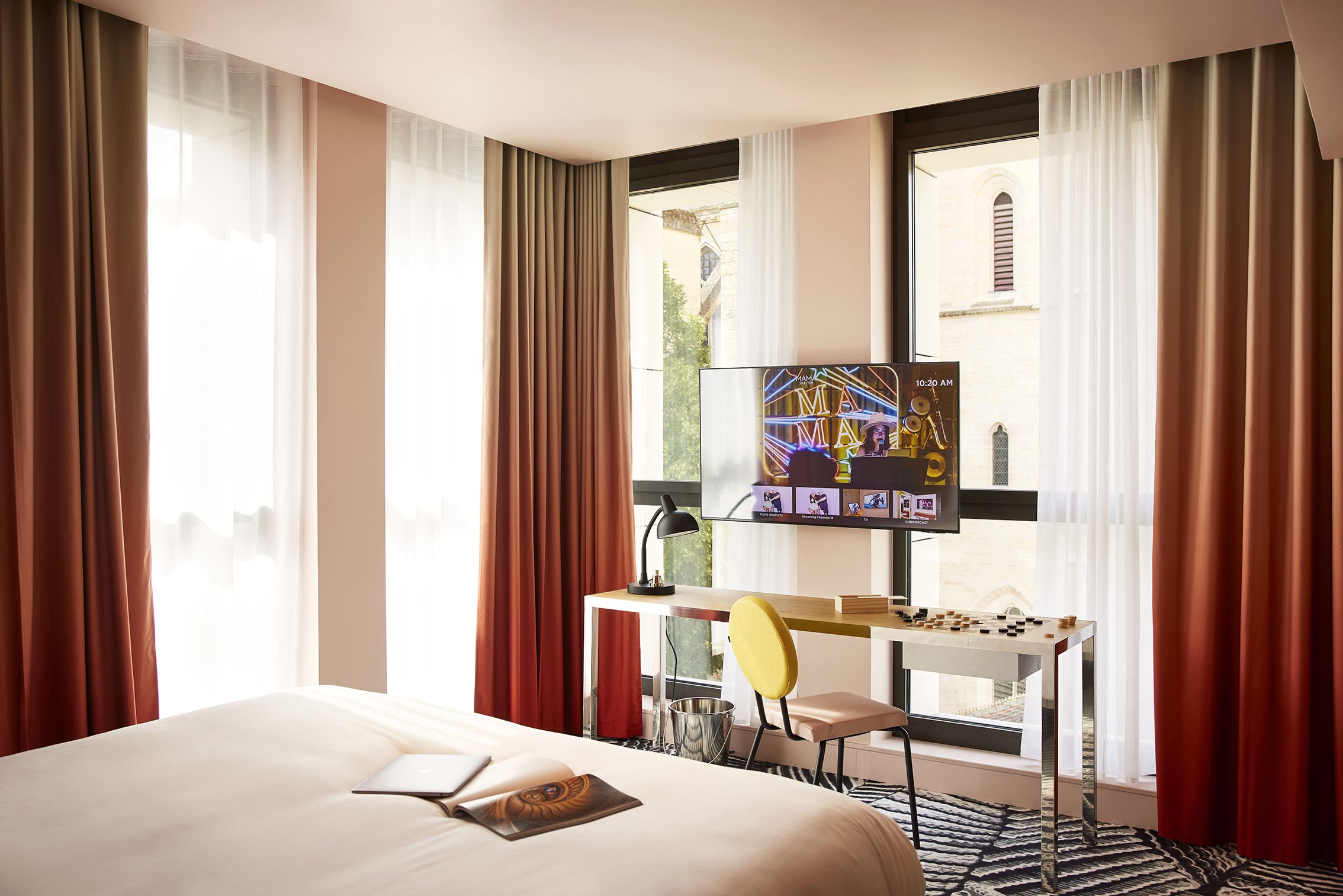 Mama Shelter, on rue du Maret, next to Saint-Bénigne Cathedral and Jardin Darcy, is located in the former health insurance offices, a brutalist building from the 1960s, listed as a historic French building. “A large, luminous glass box, 6 minutes’ walk from the station, in the heart of the city,” explains Benjamin El Doghaïli, lead architect of the Mama Shelter design studio, reflecting on his latest “playground” and adding, “the atmosphere of Dijon is uplifting, inspiring, light and playful.”