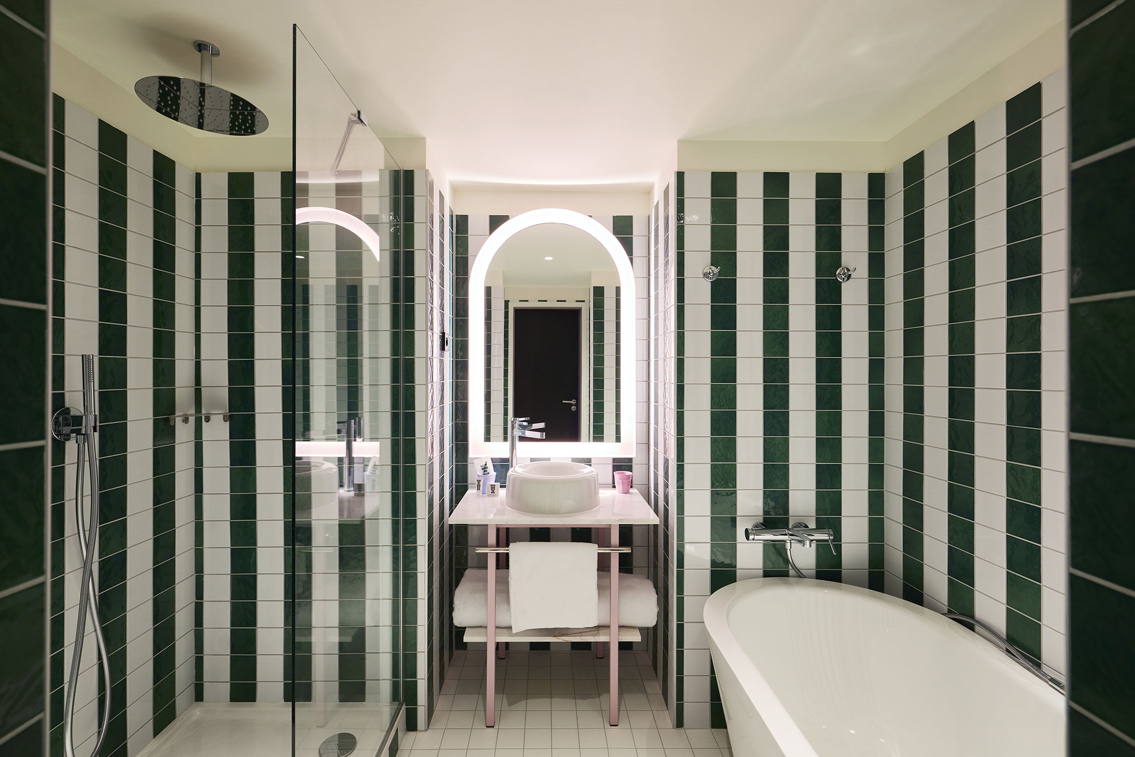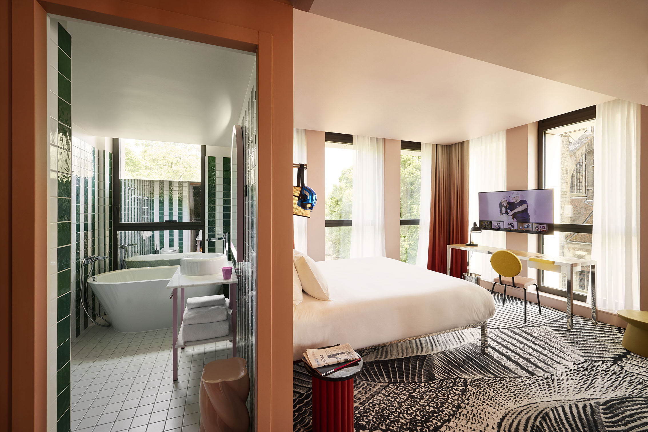 The property’s black and white carpeting is designed by Lila Mercier, representing Burgundian vineyards, and the patterns and colours on the caning on the headboards represent the glazed roofs found in buildings around Dijon. “This Mama is a spoiled child, playful, adorned with warm colours, terra cotta, powder pink, and green. Each of its rooms and suites is distinguished, for the first time at Mama, by separate toilets, Tom Dixon basins, large showers and, in some cases, baths. Further details that affirm its personality include: a charming bench, a desk with a chessboard-shaped top that can be removed to play… even in bed. But above all, they are flooded with natural light, generous, magical, which ennobles every corner, gives relief and depth, even to the concrete.”