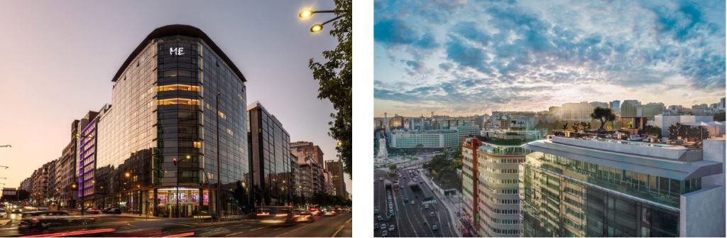 ME Lisbon, Spain. Facade and aerial rendering. Top: Entrance
