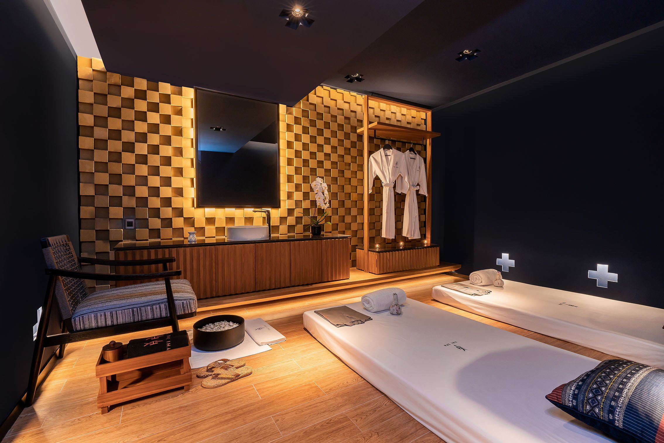 “For the Spa, the inspiration struck me during an evening walk at Tha Phae Gate [in Chiang Mai], where I witnessed the captivating contrast between the deep twilight sky and the brick walls of the city gate,” Mr Songsak recalled. “Drawing from this experience, the spa’s layout was intentionally designed to evoke a sense of peace and tranquillity.”