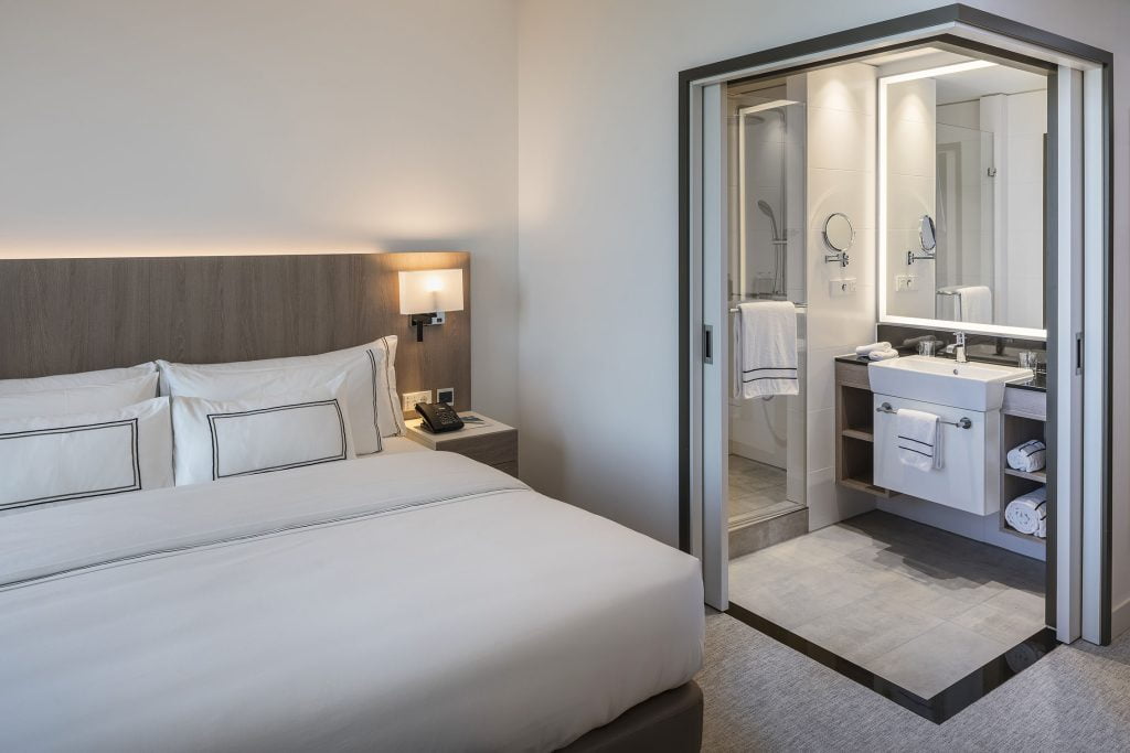 A few design highlights add interest to the guestrooms, without becoming a distraction. A wave-like textured wall panel in off-white behind the bed in premium and Level rooms brings a sense of calm. And a jaunty tripod standard lamp with asymmetric shade adds a touch of fun. Both pieces are from Muebles Riera Pascual (MRP).