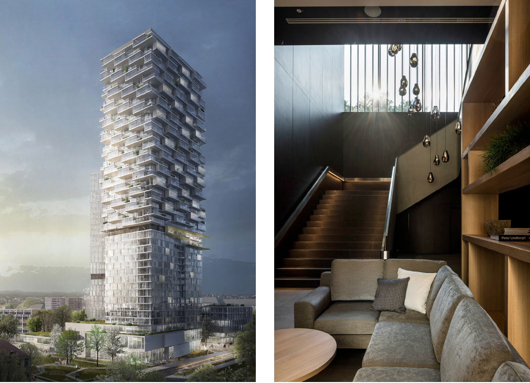 The 431-key hotel occupies the first 23 floors of One Forty West Tower, which rises 140 metres above the new, central Senckenberg Quartier. It stands in the space previously occupied by the brutalist Afe Tower, which was demolished in 2014. Balconies wrap around the new glass tower in a three-kilometre upward band. Although not brutalist, it is still a tough building, and appears top heavy, rather like an angular tornado.