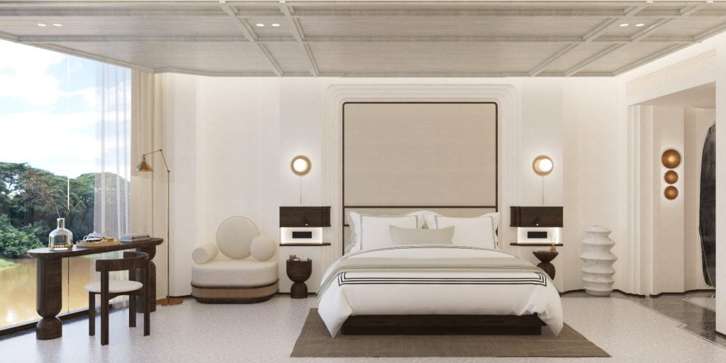 Honouring McGilvary’s legacy, the moody and eclectic McGilvary Bar features antique whiskey glasses on silver trays, banker’s lamps and a selection of antique curios. The bar’s design decisions mix classic and modern touches, including a hand-painted mural and locally crafted fixtures to reflect a timeless aesthetic the brand is known for. The adjacent café embraces modernity with luxe bubble-couches, minimalist details and clean lines. Connecting the two venues is the Ping Hill Gallery — a winding archway of fluted surfaces and undulating walls that will showcase contemporary Thai art on rotation. Outside by the river, 19th-centure passion for adventure and fascination with expeditions are celebrated at a breezy campsite, with folding campaign chairs strewn on a grassy patch under tropical fronds.