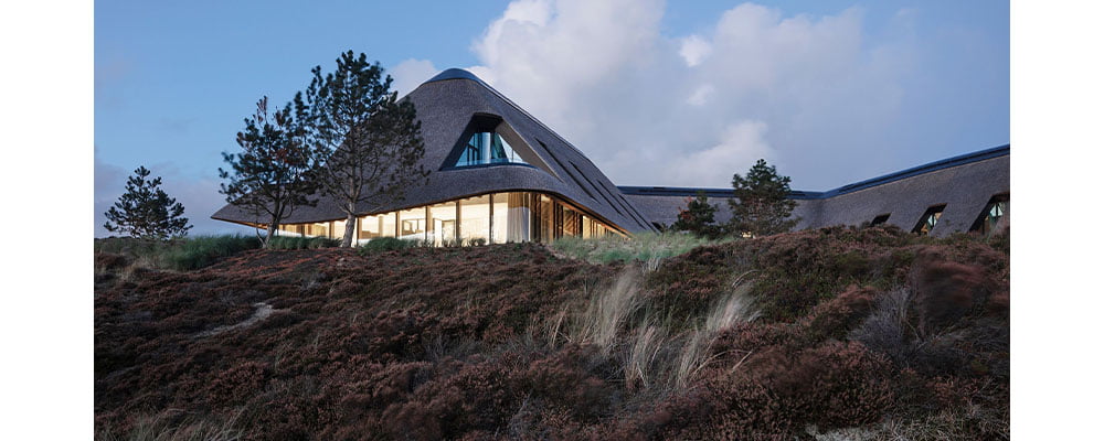 In terms of design, the main building is inspired by the Frisian houses typical of Sylt with low-pitched thatched roofs, relatively small façade areas and windows. The Lanserhof presents a contemporary interpretation: The main building rests on supports so that the ground floor could be glazed all around – a continuum of house and dune, interrupted only by partial glimpses of its inner life. The ridge and eaves swing gently, the soft shapes of the thatched roof trace the dune.