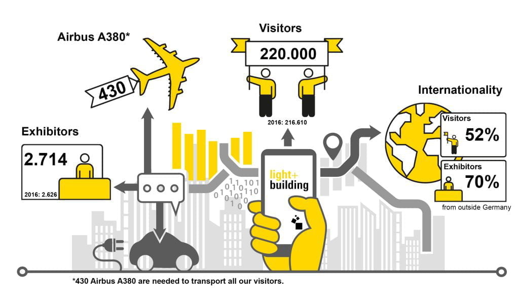 A total of 2,714 exhibitors from 55 countries launched their latest products onto the world market at Light + Building in Frankfurt am Main from 18 to 23 March 2018. Altogether, more than 220,000 trade visitors from 177 countries made their way to Frankfurt Fair and Exhibition Centre to discover the latest products, solutions and trends offered in the fields of lighting, electrical engineering and home and building automation. “Over the last six days, Light + Building presented a plethora of innovations. Everyone involved – exhibitors, partners and visitors – were delighted with the fair and this positive mood was prevalent in all halls. The upswing in the sector continues”, said Wolfgang Marzin, President and Chief Executive Officer (CEO) of Messe Frankfurt, summarising the fair.