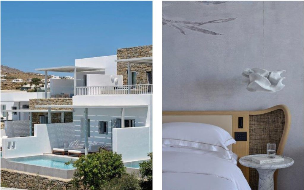 A unique and meticulous setting, born from the passion for the authenticity of the location and which enjoys a panoramic view of the famous windmills in the old port and the adjacent islands of Delos, Syros and Tinos. An architecture that ensures the interior liaises with the exterior seamlessly and elegantly, striking the perfect balance with nature. The project conceived by architect Galal Mahmoud, from Lebanese studio GM Architects, has a clear vision of the ideal stay in this accommodation facility, which is destined to become the new benchmark for luxury destinations in the Aegean Sea.