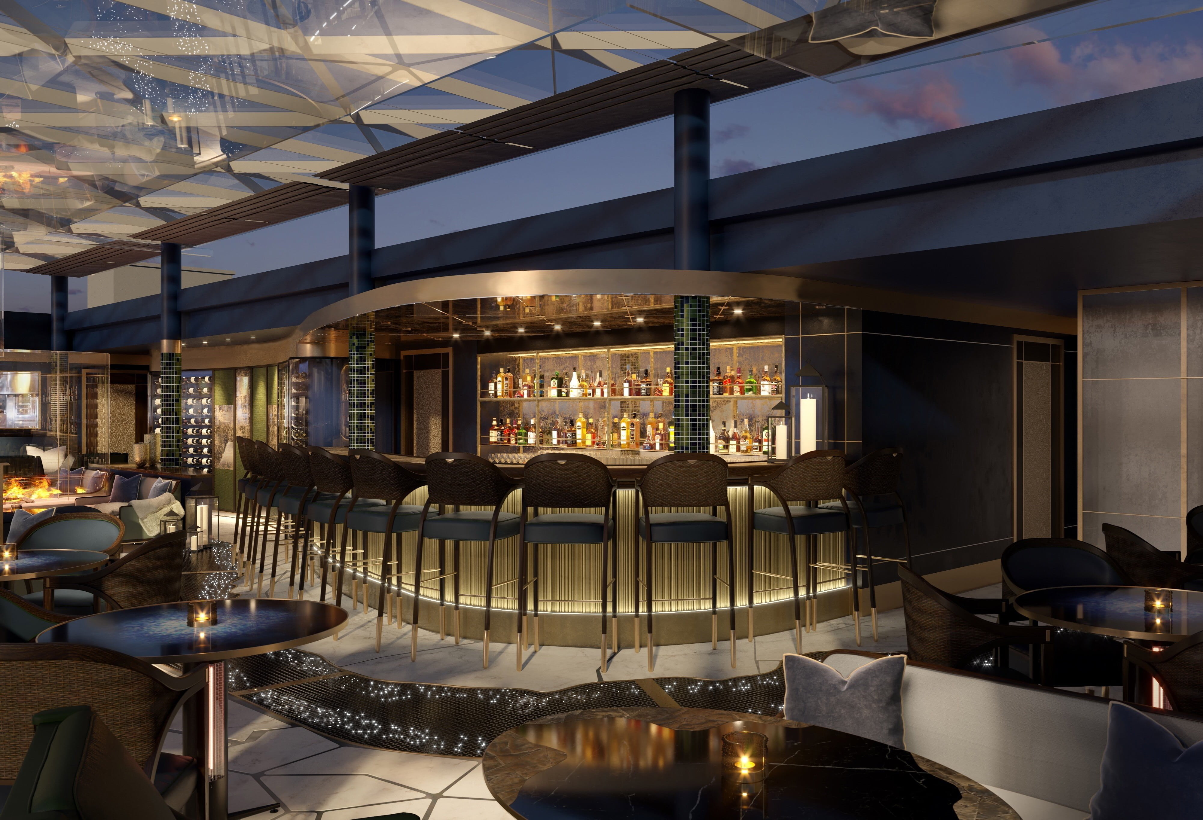Reflecting the surrounding skyline, the design will see a mix of sophisticated blue hues along with copper and metallic tones (see pictured). There will be open fires, floor to ceiling glass, expansive wine and spirits collections, a shisha and cigar terrace and soft, sumptuous seating, perfect for whiling away long evenings with family, friends and colleagues alike.