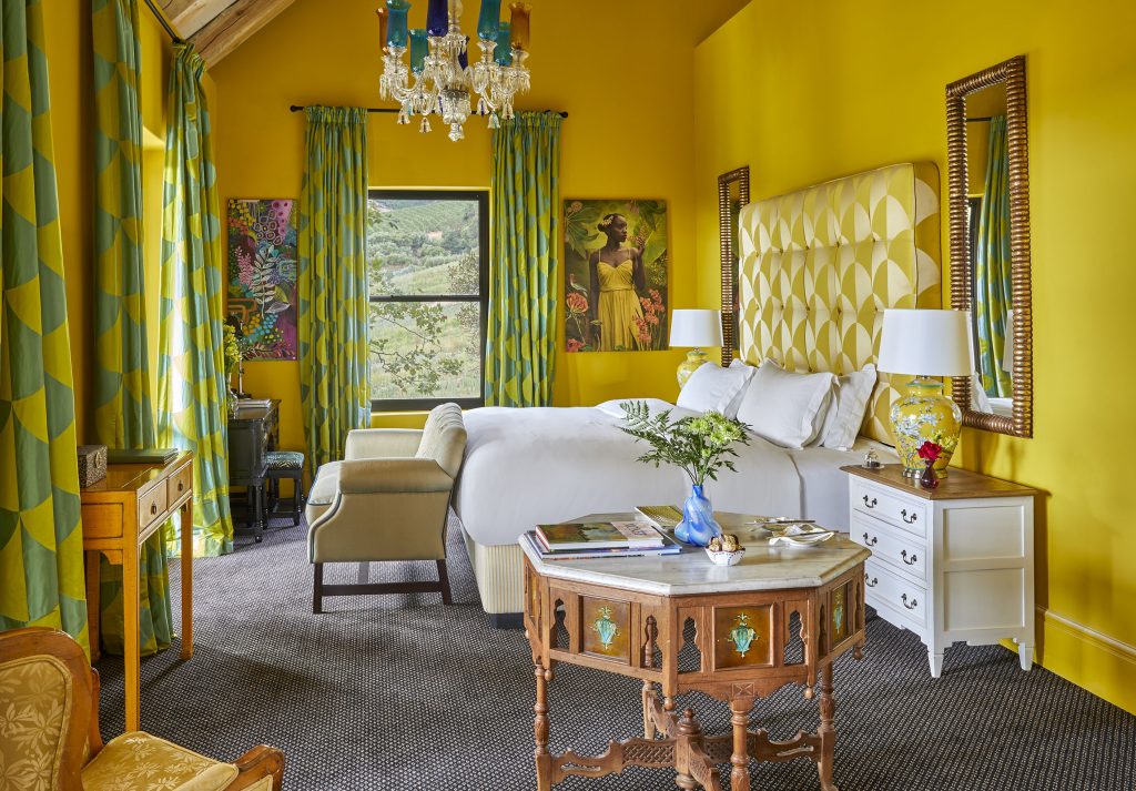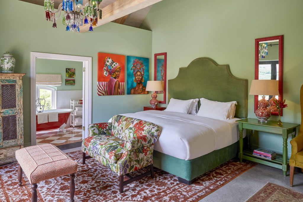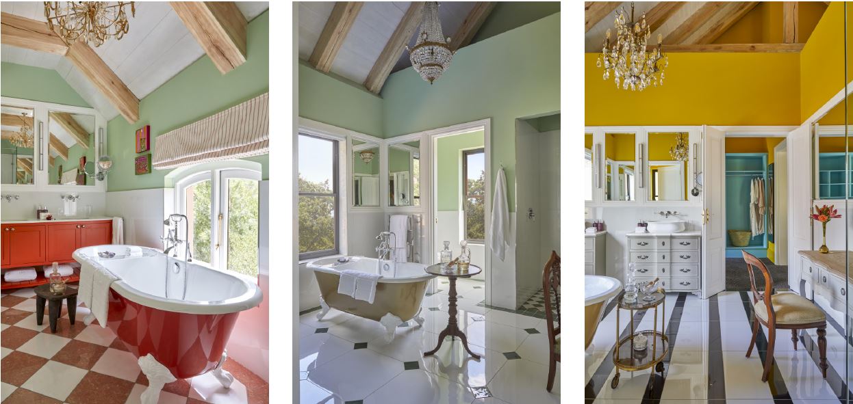 Each suite at Franschhoek House has been individually designed to tell its own story. Luxurious fabrics, antique furniture, and curated artworks are combined with bold colour palettes and intricate detailing, creating spaces full of character and charm. Large windows and high-pitched ceilings enhance the feeling of openness, allowing light to flow freely through the villa, while stunning chandeliers add a touch of grandeur and occasion.