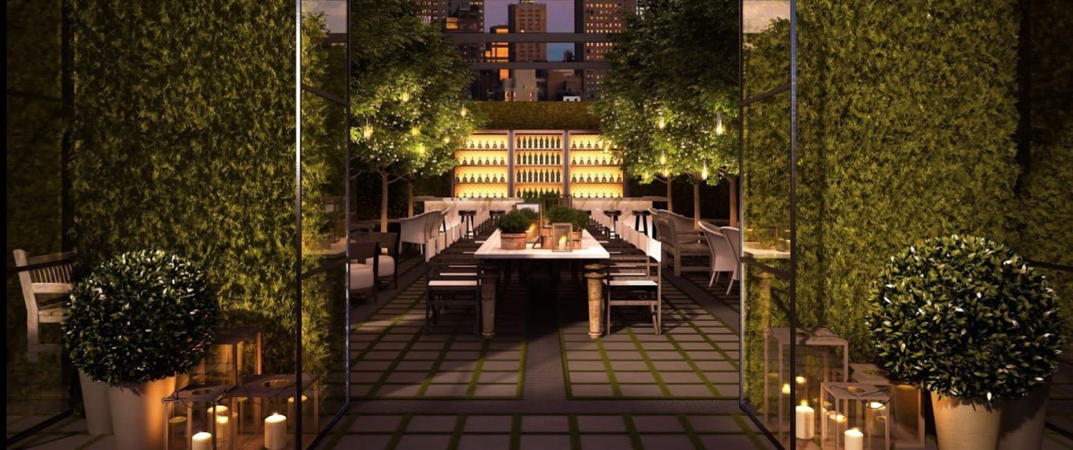Off the Terrace Restaurant, a similar feeling awaits on expansive terraces that were inspired by the L’Orangerie at Jardin des Tuileries in Paris. The outdoor space in totality with thousands of plants, trees and ivy is perhaps the biggest indoor landscaping effort in the country was designed by Madison Cox and is literally, multi-level gardens in the sky. The public space interiors with their rich woods, lush velvets, waxed leathers, polished marbles and smooth metals are combined to create a chic, simple, hip, serene and luxurious setting, an antidote to the hectic life just outside the hotel’s doors.