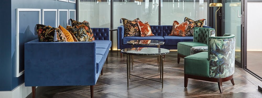 The wallpaper to the men’s loo’s and the tenth floor lift lobby was developed by Elegant Clutter and capture London landmarks in a Georgian inspired wallpaper. House of Hackney fabrics have been used on key pieces of furniture throughout the hotel.