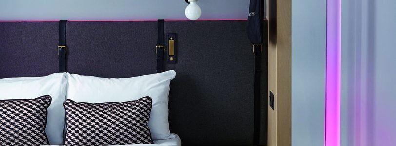 Nulty Lighting creates a statement lighting scheme for the bedrooms. Upon arrival the guests are greeted with a fun striking light setting; a feature rod light illuminates the bedroom in pink whilst the bathroom spills out a subtle purple glow creating an impactful arrival. The light changes to a warm white light once the guest puts their key card in the vingcard slot.