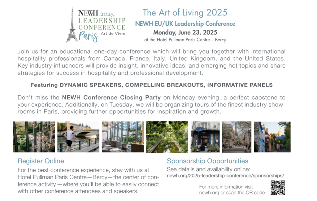 “Paris is the perfect backdrop for this momentous event,” says Chris Tucker, CEO of NEWH, Inc. “Art de Vivre is more than a theme—it’s an invitation to immerse in inspiration, innovation, and the international perspectives shaping our industry’s future. We welcome hospitality professionals from around the world to join us for a day of discovery and connection.”