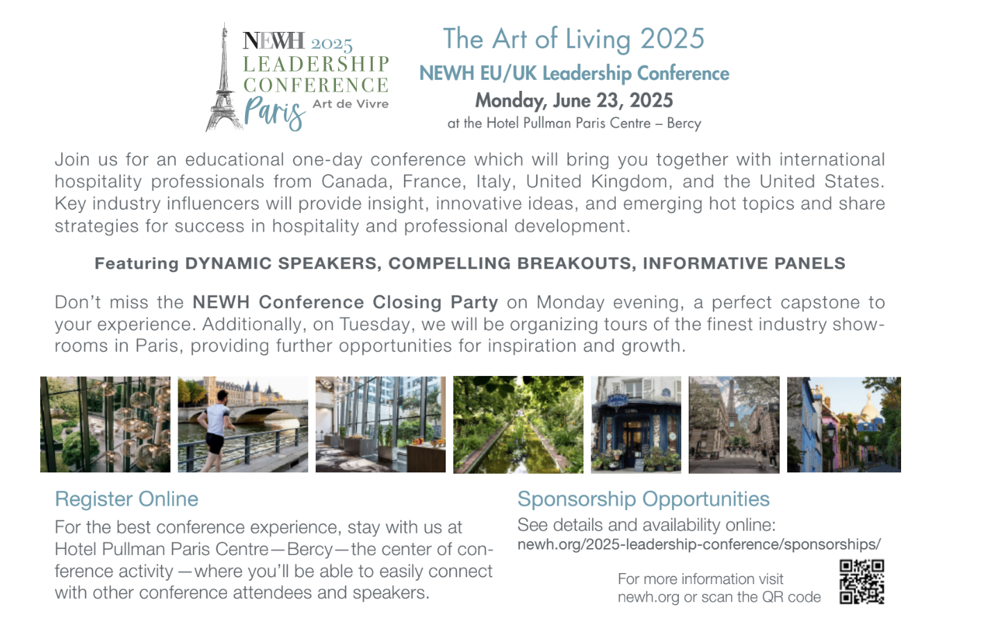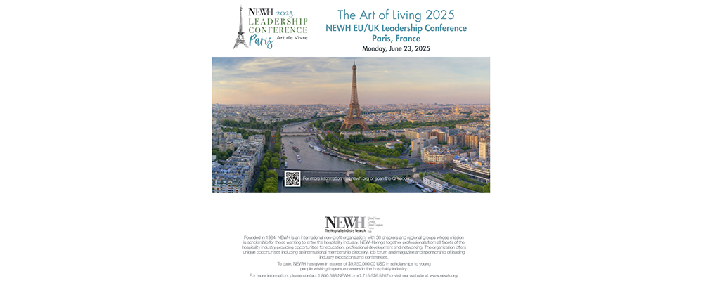 NEWH, Inc. (Network of Executive Women in Hospitality), the premier organization dedicated to scholarships, education, mentorship, and networking in the hospitality industry, proudly announces its 2025 Leadership Conference, Art de Vivre (Art of Living), taking place in Paris on Monday, June 23, 2025, at the Pullman Paris Centre – Bercy.