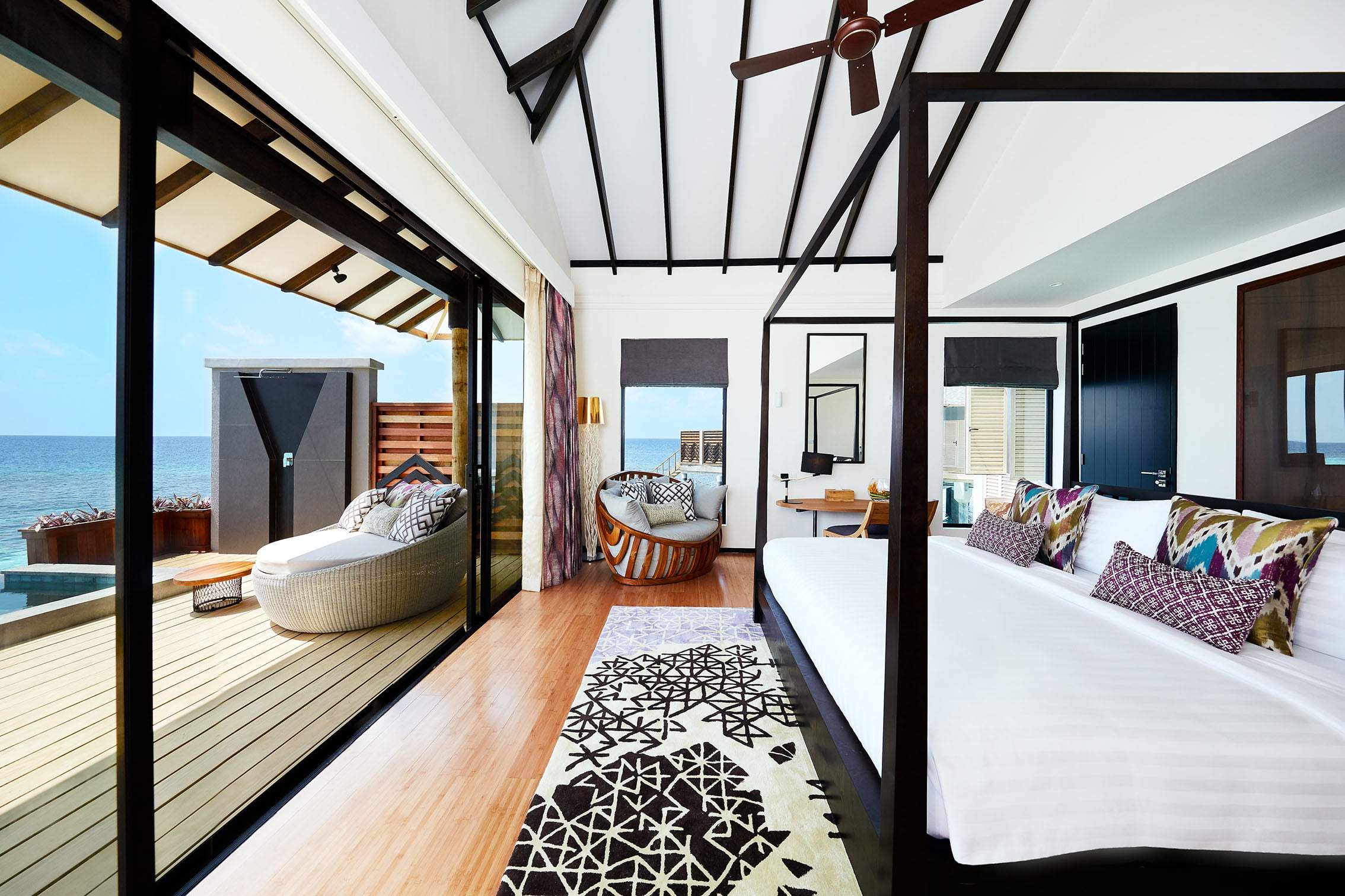 NH Collection Maldives Havodda Resort. Above: Over Water Pool Suite. Top: Thari Bar