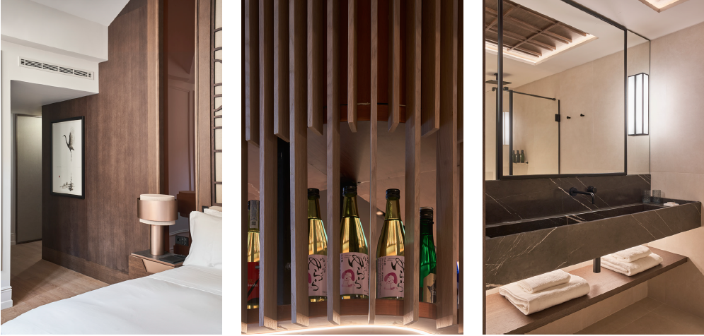 The interiors, conceptualized by Tomas Alía from Studio Caramba, seamlessly unite the Franco-Basque Belle Époque style of the building with Nobu’s signature Japanese minimalism. Using natural materials and traditional millwork, Alía creates a sense of calm and elegance from the moment the guest arrives. The entrance and lobby area are inspired by Torii gates with clean, simple lines, arriving at a stunning sculptural central staircase which leads to guest rooms and suites, where neutral tones contrast with dramatic floor-to-ceiling headboards. Nobu Terrace features an inside – outside space, creating a dialogue with the sea and coastline, while in Nobu restaurant, the classic, pared down Nobu aesthetic allows the dishes to be the star of the show.