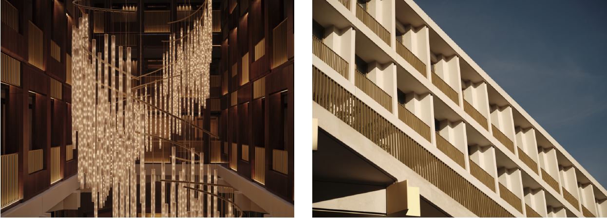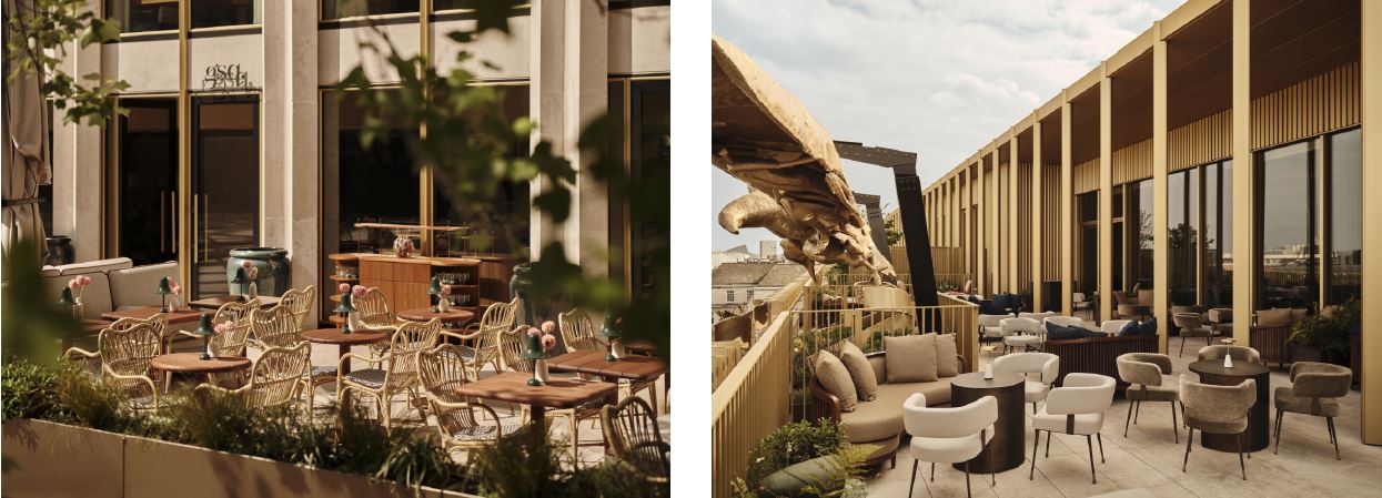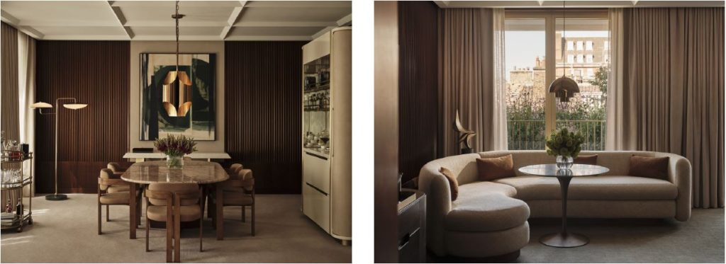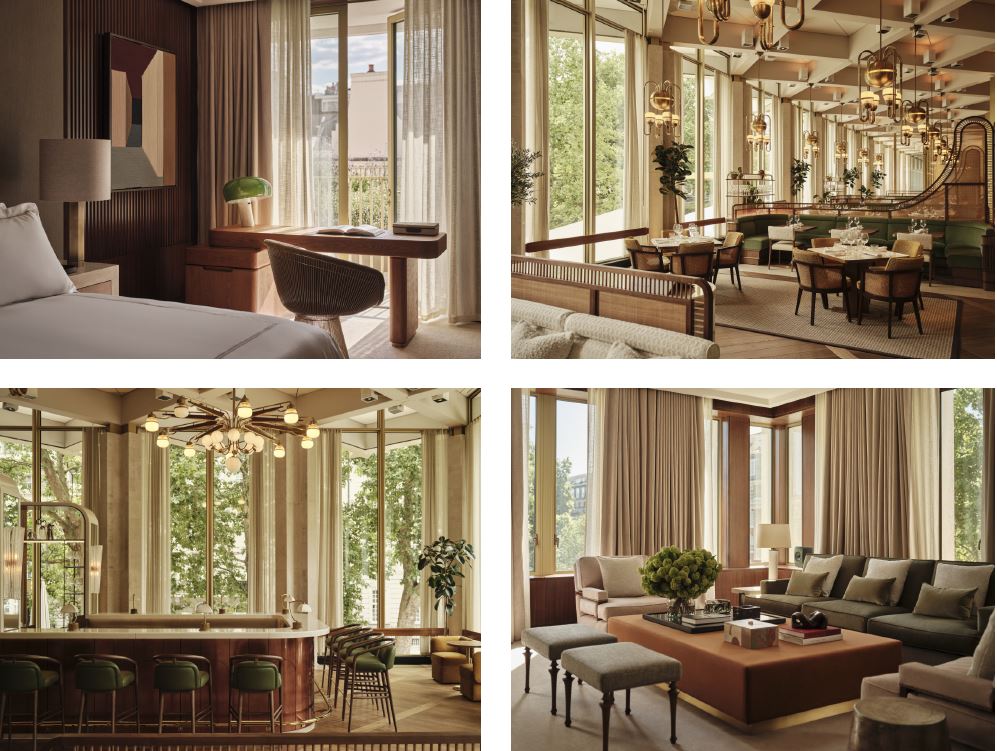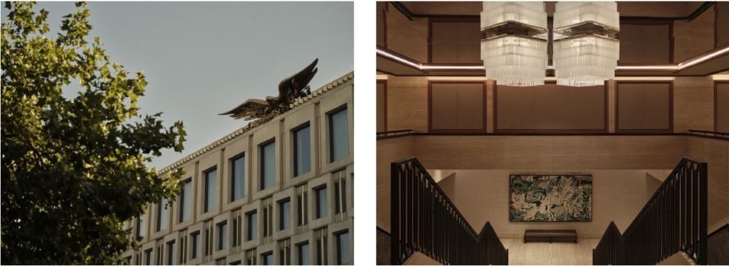 The building’s distinctive angular, original diagrid exterior gives way to interiors of refined sophistication, where sleek modern lines meet plush textures. Interiors of the 144 spacious and thoughtfully designed suites have been led by Joseph Dirand. Each reflects Dirand’s vision of celebrating craftsmanship and the property’s storied past to create a calming and inviting atmosphere. Bathed in natural light from the floor-to-ceiling windows that give way to some of the capital’s most captivating views, the transformation stands as a testament to timeless elegance and innovation, with a colour palette of warm tones punctuated with gold anodised aluminium accents that complement the building’s original stone facade.