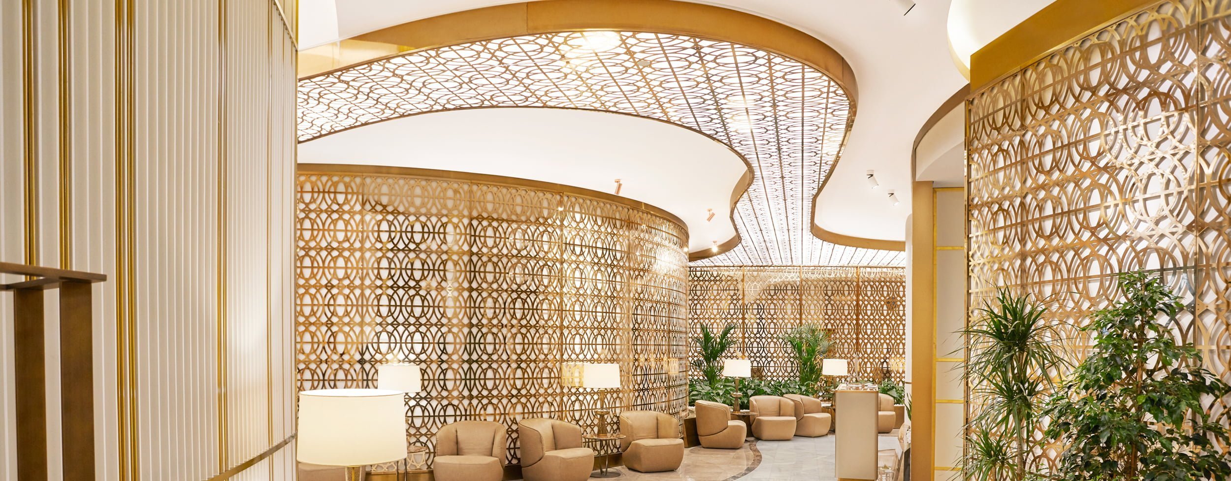 Further to this premium lounge, all First Class and Business Class international guests travelling with Oman Air to Muscat International airport are invited to enjoy the impressive arrival lounge. Nature has been the inspiration behind this lounge and the elegant and tranquil surroundings offer semi-public spaces with plenty of light. The service area is located at the upper corner in order to leave a large communal space for guests to enjoy.