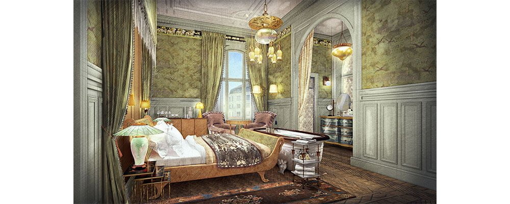 Best-known for their elaborate, detailed, and meticulously researched designs, GrecoDeco will once again head up the interiors, embellishing the spaces with a mix of antiques, original artwork, decorative details and classic Scandinavian furnishings. The villa’s thoughtfully designed bedrooms and electically themed public areas, are inspired by a range of eras including Classic Norwegian, Art Nouveau, Arts & Crafts and a bit of Japonisme, all rooted in the history of the building. Guests can imbibe cocktails among the spirits in the Villa’s intimate Ghost Bar, with mosaic floors combining Golden Onyx with Norwegian Granites, silver gilt walls, and antique light fixtures. The bedrooms boast opulent details and lush textiles, such as custom-designed furnishings with marquetried details recalling 19th century Norwegian motifs, bespoke hand-knotted rugs, beds from innovative Swedish sleep brand Hilding Anders, and dreamy bathrooms with custom tiles.