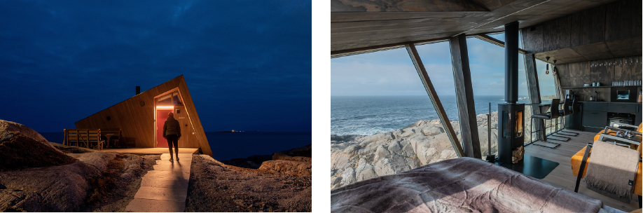 The architect behind Panoramahyttene, Roald Bø from Holon Arkitektur, has been inspired by the landscape with the view as the main focus. The architecture allows you to get close to nature without the cabins taking up too much space or leaving too many traces. To really take in the stunning surroundings, all the cabins have large windows that lean towards the sea.