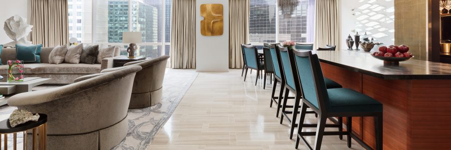 Park Hyatt New York, Midtown Manhattan’s luxury destination, has completed a redesign of its most coveted accommodations: the Presidential Suite. The stunning 2,300 square-foot one-bedroom suite located on the 23rd floor features custom furnishings, wall-to-wall stone flooring, floor-to-ceiling windows, expansive living space, a dining room with a full dining table, a kitchen island and personal bar, Butler’s kitchen, state-of-the-art media system. The suite’s private king bedroom boasts south- and east-facing views of Manhattan’s iconic skyline, as well as partial views of famed Central Park.