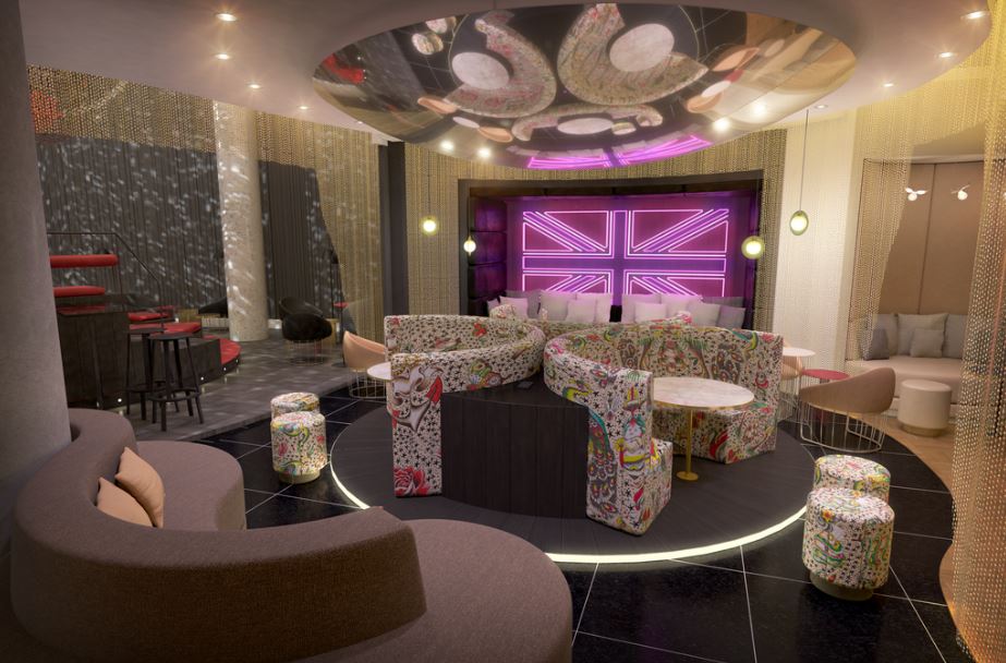 Bespoke leather sofas tattooed by Soho’s iconic Frith Street Tattoo studio are surrounded by spherical mirrored ceilings and colourful lights giving guests a rose-tinted view of the iconic Leicester Square below. A revolving curved sofa with tiered seating and a folding partition wall for intimacy aims to encourage discrete revelry, whilst interactive DJ booths will ensure resident night owls can always take centre stage.