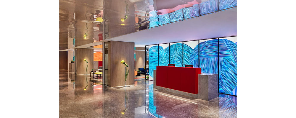 Greeting guests at the intimate ground level lobby are floor-to-ceiling windows that reveal the close proximity of the hotel to neighbouring luxury brands. The grey coloured marble flooring is enlivened by vivid pops of blue and orange, while the design scheme incorporates colour-changing light panels with abstract brush strokes, and modern artwork.