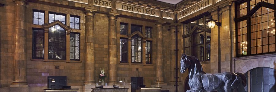 The Principal Manchester occupies a listed Victorian Gothic Revival building originally designed in 1891 by Alfred Waterhouse, the architect behind London’s Natural History Museum, as the headquarters for The Refuge Assurance Company. Situated across the road from Manchester’s Oxford Road station and ten minutes from Manchester Piccadilly station, the hotel features 270 bedrooms and its own restaurant and bar. The Refuge by Volta is a palatial 10,000 square foot restaurant adjacent to the central lobby and comes complete with a 40ft granite bar and The Winter Garden, a beautiful interior glasshouse for afternoon tea served amongst leafy oak trees and trailing botanicals. Guests enter the hotel through a vast neoclassical lobby under a domed stained glass cupola, in which stands a 3m (10ft) 600kg (1300lb) bronze statue of horse sculpted by Sophie Dickens. Many of the guestrooms contain listed period details, from wood panelling and fireplaces to tiled brickwork.