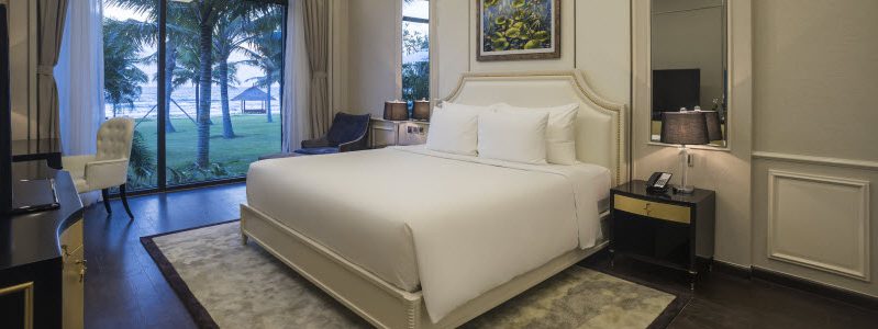 In a captivating fusion of Eastern and Western aesthetics, striking artwork adorns the resort including abstract sculptures crafted out of Vietnamese marble and vertical pressed panels referencing the lotus flower, palm fronds and more native Vietnamese flora. Spectacular lighting installations that pay homage to the Gulf of Thailand, such as a melange of glass seaweed and schools of countless glass fish that appear to swim swiftly past smooth eggshell white columns, greet guests in the capacious foyer and lobby areas.