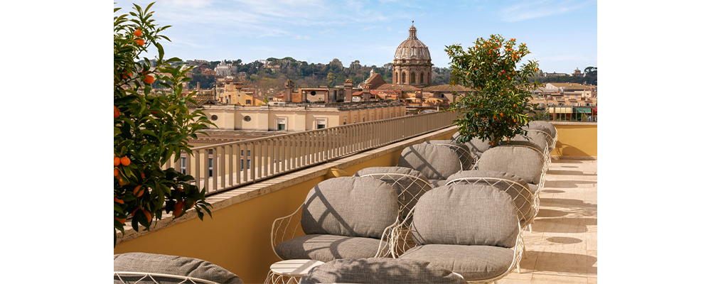 Each of the hotel’s 84 rooms is designed to offer stylish spaces that embody elegance through carefully selected materials. Opulent Carrara marble bathrooms, artistic Fornasetti wallpaper, rich wooden floors, and modern design ensure that all the rooms have an air of understated elegance in which every detail reflects a commitment to sophistication. Refined and cosmopolitan, earth tones blend seamlessly with pops of colour throughout wallpaper accents, soft furnishings, and local details. The hotel’s Panoramic rooms feature spacious terraces with breath-taking views of the city in addition to elegant furnishings which are a study in simplicity and refinement. Extending across 80m², the Friends and Family Stay Rooms can accommodate up to six adults looking to enjoy their time in the Eternal City. Guests can relax and rejuvenate in the hotel’s Turkish bath and fitness center or find a quiet moment of luxury amidst the hustle and bustle of the city.