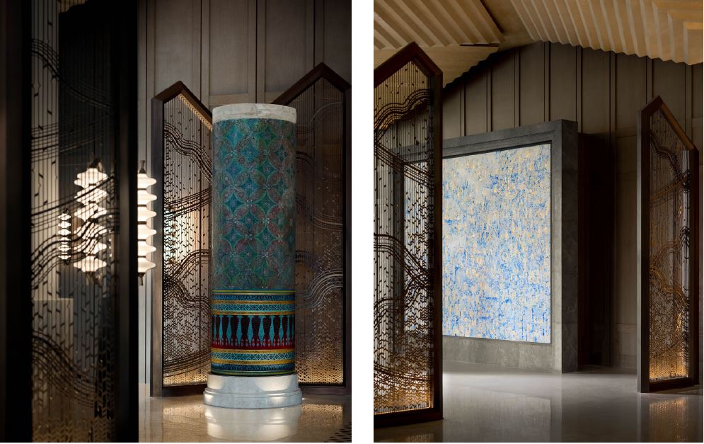 Left: Two beautifully preserved antique pillars, once part of the original hotel’s Benjarong restaurant and featuring intricate paintings by Paiboon Suwannakudt, a master of neo-traditional Thai mural art, grace the entrance to the hotel’s more intimate areas, offering a timeless connection to the past. Right: the hotel’s deep-rooted connection to the community is reflected in the vibrant mural by rising Thai artist Sakon Malee.