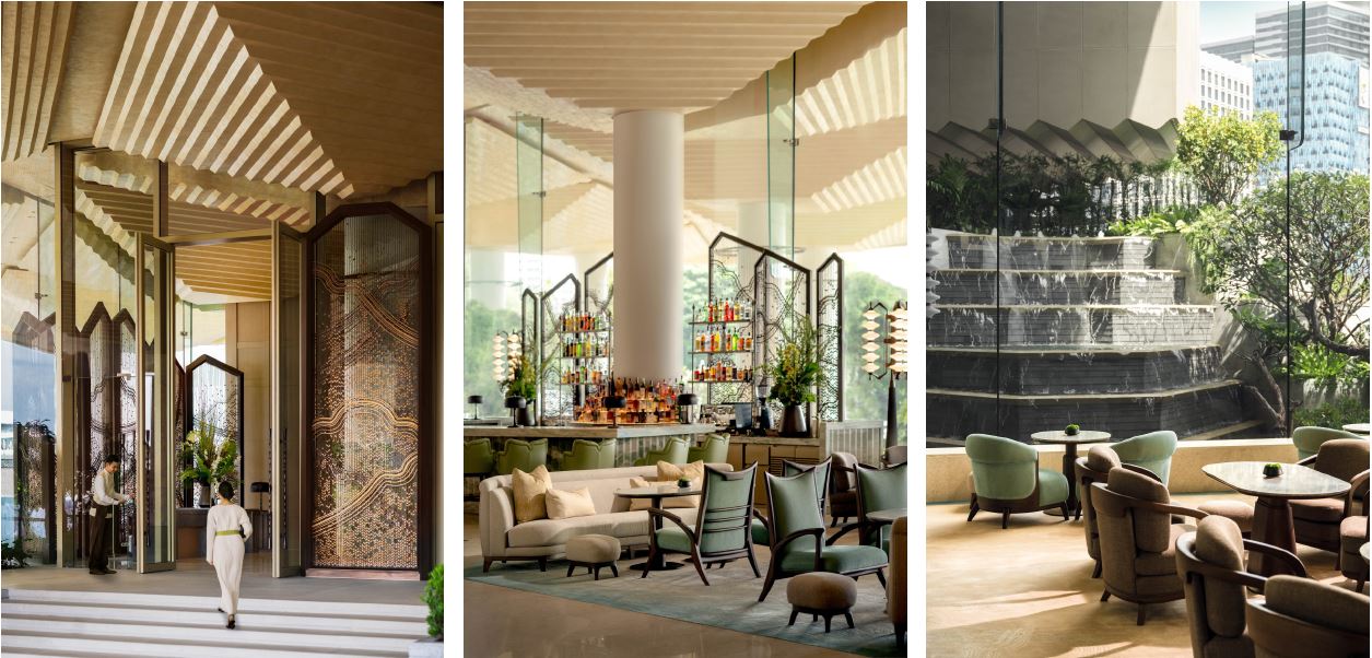 The hotel’s unique design-led journey begins the moment the guest steps into the striking arrival lobby. Inspired by the artistry of traditional Thai pavilions, the triple-height lobby recreates the grand arrival experience of the original property and elevates it with a striking juxtaposition of returning signature elements – such as a lush waterfall garden featuring a tiered geometric composition and preserved beloved tropical trees that were first planted at the original hotel. A commissioned artwork mural by rising Thai artist Sakon Malee is prominently displayed to honour the hotel’s deep-rooted ties to the community, alongside traditional earthenware from Koh Kret – a small island in the Chao Phraya River known for its pottery traditions.