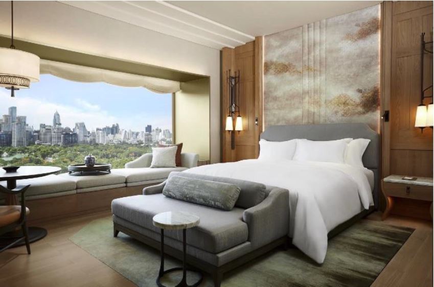 The guest rooms, starting at 50 sq m, blend traditional elegance with modernity. Each room boasts vast cantilevered picture frame windows that capture breathtaking, uninterrupted views of Lumpini Park, inviting guests to immerse themselves in the stunning skyline of Bangkok.